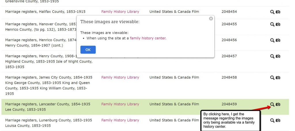 And that’s where it gets confusing. In this image below, you will see I can’t access the Virginia Marriage’s I want to see. It tells me that I must go to a Family History Center.